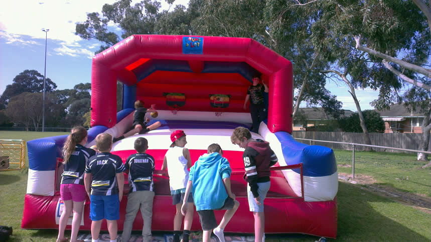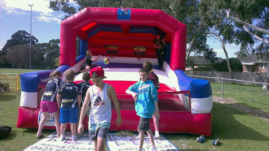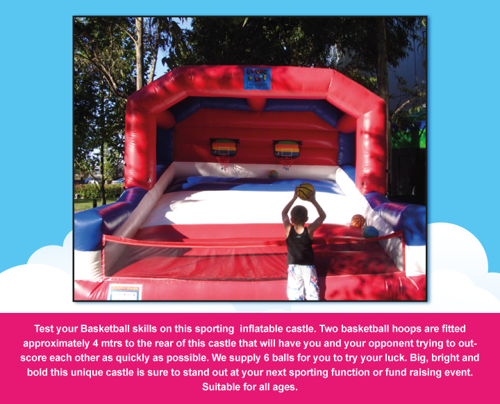 Test your Basketball skills on this sporting inflatable castle. Two basketball hoops are fitted approximately 4 mtrs to the rear of this castle that will have you and your opponent trying to outscore each other as quickly as possible. We supply 6 balls for you to try your luck. Big, bright and bold this unique castle is sure to stand out at your next sporting function or fund raising event. Suitable for all ages.