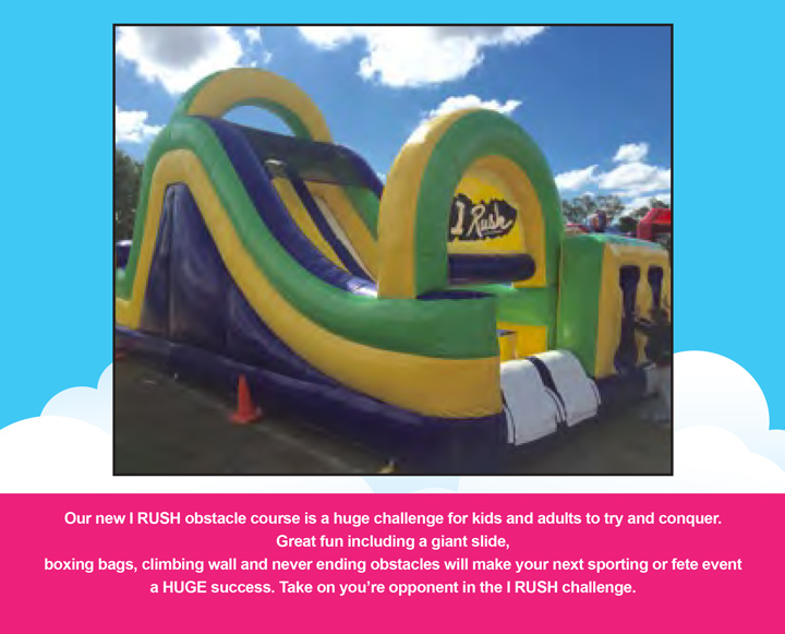 Our new I RUSH obstacle course is a huge challenge for kids and adults to try and conquer. Great fun including a giant slide,